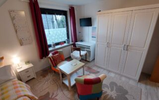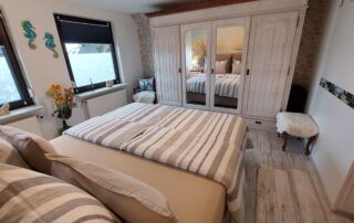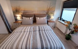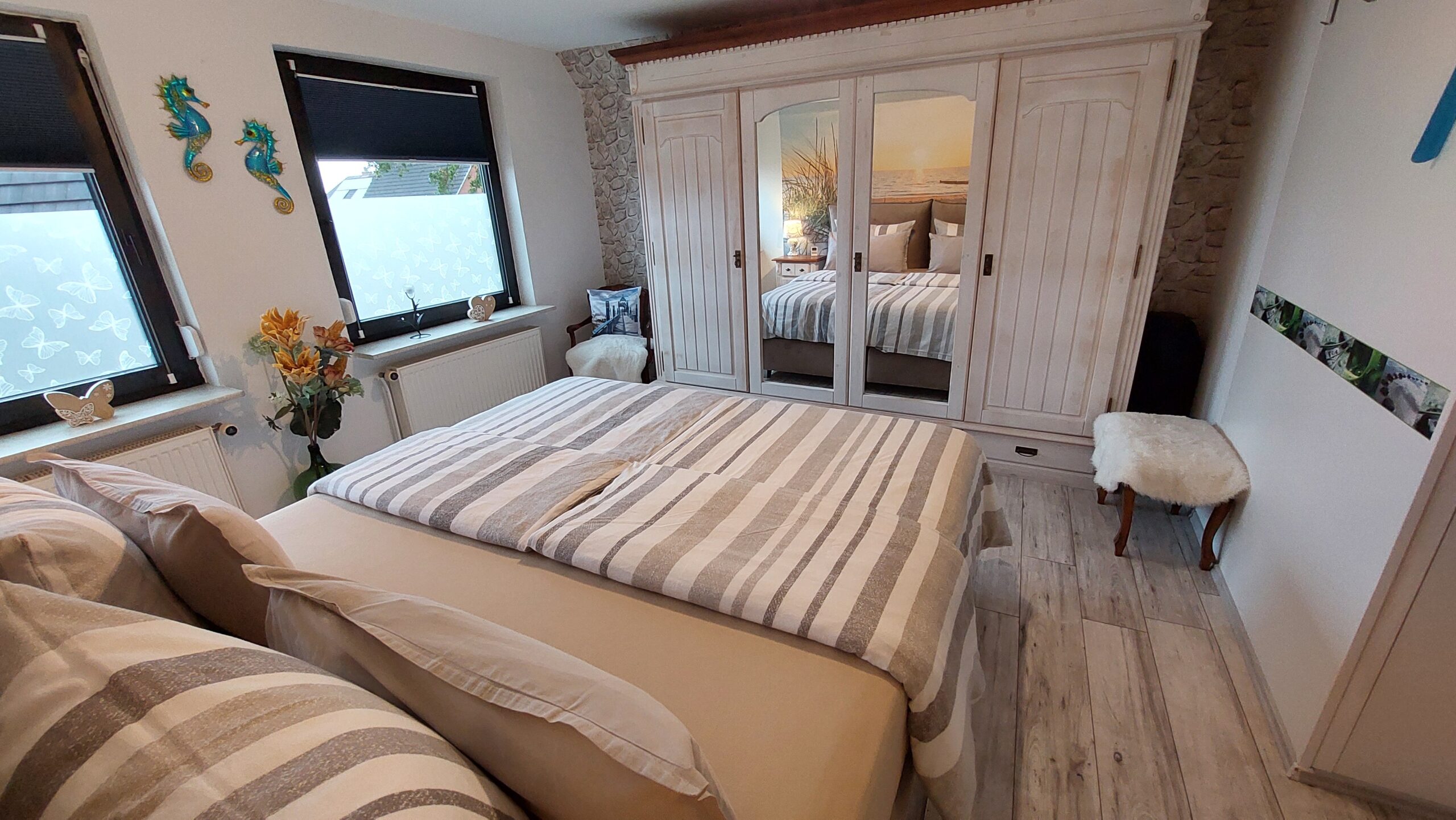 Ob zu zweit, 4 Freunde oder 4-köpfige Familie (+ Baby im Reisebett bei den Eltern) + 2 liebe, stubenreine Hunde (bis Kniehoch). Unsere moderne 3- Zimmer-Wohnung Mery mit 2 Schlafzimmer ist im OG des Hauses, mit großer Dusche/WC + Wasch Trockner, Einbauküche mit Essplatz für 4 Personen, Kaffeemaschine + Senseo Pad- Maschine, Toaster, Wasserkocher, Ceran Kochfeld, Backofen, Heißluft Fritteuse, Mikrowelle, Kühlschrank mit Gefrierfach. Es sind 4 Betten vorhanden. Das Doppel Schlafzimmer grenzt an das Wohnzimmer mit den Maßen des Doppelbetts 180 x 200 und das 2-Bett Zimmer mit Einzelbetten 90 x 200, sowie TV (beide Schlafzimmer mit Rolladen). Im Wohnzimmer ist eine geräumiges und gemütliches Ecksofa mit Fußablage. von hier geht es auf den überdachten und windgeschützten Balkon mit Gartenblick und auf unseren Koi Teich sowie die Geest Landschaft Richtung Norddeich/ Westermarsch. Es sind ca. 10 Fahrrad Minuten zum Badestrand Norddeich (mit extra Hundestrand sowie toller Strandpromenade) oder in die schöne Altstadt von Norden. Eine Tischtennisplatte ist im Haus, sowie eine zusätzliche Gästetoilette im Treppenhaus.